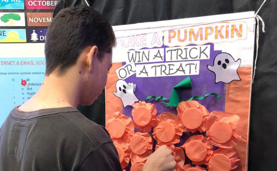 No Colégio Estadual Jardim Paulista, onde são desenvolvidas as aulas com os estudantes atendidos pelo programa, a professora Sandra Borges tematizou a sala de idiomas com muita criatividade, ilustrando as características temáticas referentes à comemoração americana.