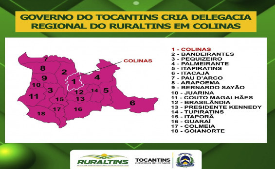 O Governo do Tocantins, por meio do Instituto de Desenvolvimento Rural do Tocantins (Ruraltins), criou nessa quinta-feira, 30, a Delegacia Regional de Apoio de Colinas do Tocantins. A Portaria nº 48/2022, publicada no Diário Oficial do Estado, oficializa a criação da 8ª Regional, que tem como finalidade atender os agricultores familiares e os produtores rurais com assistência técnica e extensão rural aos municípios de Bandeirantes, Pequizeiro, Palmeirante, Itapiratins, Itacajá, Pau D´Arco, Arapoema, Bernardo Sayão, Juarina, Couto Magalhães, Brasilândia, Presidente Kennedy, Tupiratins, Itaporã, Guaraí, Colmeia e Goianorte.
