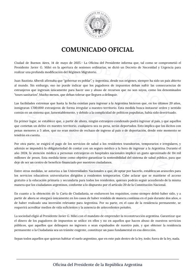 Seguindo uma linha de governo de direita, assim como muitos outros presidentes latino-americanos e da Europa, o governante começa a endurecer as regras para os imigrantes, tanto novos quanto os já residentes. Ele afirma que a Argentina sempre foi um país aberto ao mundo e a todos que desejam contribuir com a sociedade, mas que agora percebe que os imigrantes estariam se utilizando dos benefícios sociais pagos pelos cidadãos argentinos.