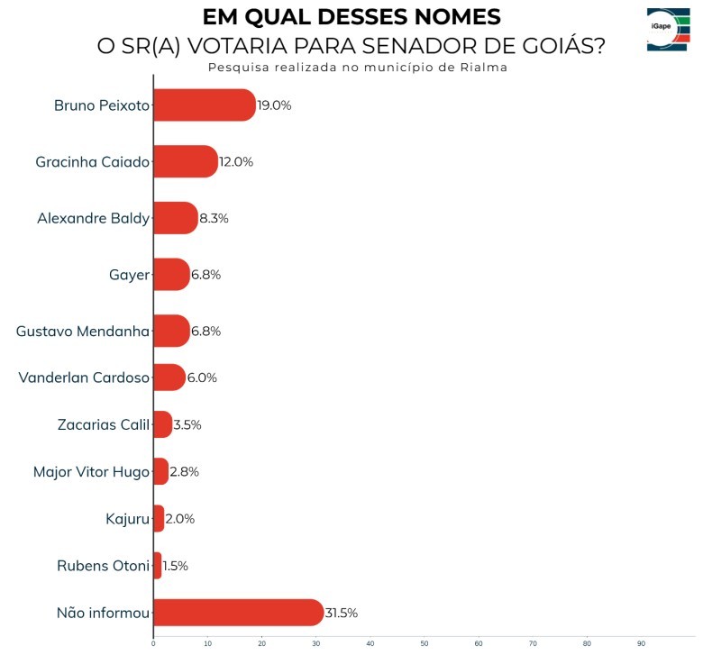 O presidente da Assembleia Legislativa de Goiás, Bruno Peixoto, é o nome mais citado para o Senado entre os eleitores de Rialma, segundo pesquisa estimulada do Instituto Gazeta de Pesquisas. Peixoto aparece com 19% das intenções de voto.