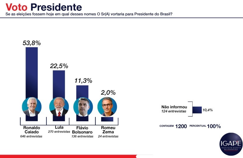 Levantamento do Instituto Gazeta de Pesquisas (IGAPE) indica que o governador de Goiás, Ronaldo Caiado, lidera as intenções de voto para a Presidência da República no estado. Se as eleições fossem hoje, Caiado teria 53,8% das preferências dos entrevistados.