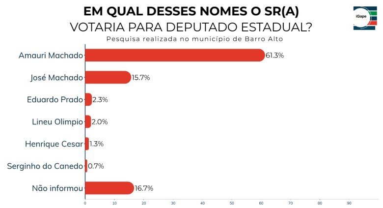 Levantamento realizado pelo Instituto Gazeta de Pesquisas no município de Barro Alto mostra ampla vantagem de Amauri Machado na disputa por uma vaga na Assembleia Legislativa de Goiás. De acordo com os dados da pesquisa estimulada, Amauri aparece com 61,3% das intenções de voto entre os eleitores da cidade.