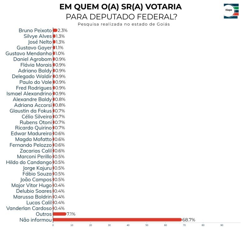 Na sequência estão Silvye Alves (1,3%), José Nelto (1,3%), Gustavo Gayer (1,1%) e Gustavo Mendanha (1,0%). Outros nomes lembrados foram Daniel Agrobom, Flávia Morais e Adriano Baldy, todos com 0,9%. Delegado Waldir, Paulo do Vale, Fred Rodrigues e Ismael Alexandrino também registraram 0,9% cada.