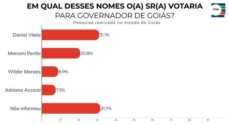 O Instituto Gazeta de Pesquisas (IGAPE) iniciou uma série de levantamentos mensais sobre a disputa eleitoral em Goiás para 2026. A primeira rodada mostrou que, se as eleições para governador fossem hoje, Daniel Vilela teria 31,1% das intenções de voto. Em segundo lugar aparece Marconi Perillo, com 20,8%.