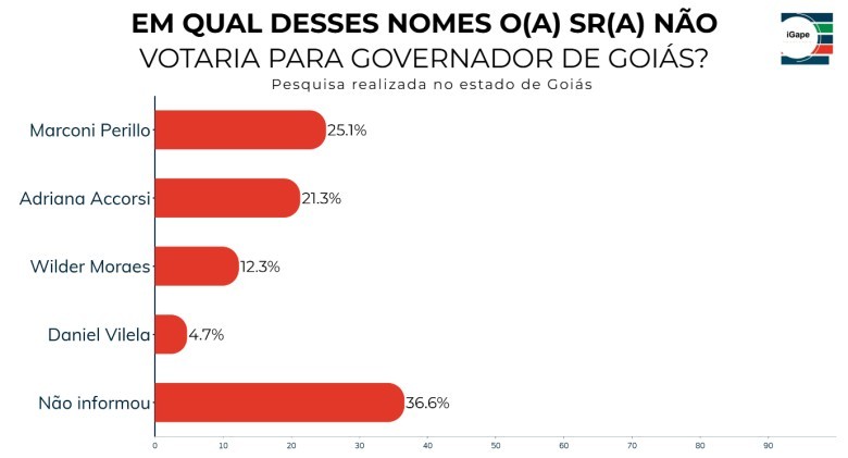 O levantamento também mediu a rejeição dos candidatos. Marconi Perillo lidera nesse quesito: 25,1% afirmaram que não votariam nele de jeito nenhum. Adriana Accorsi foi citada por 21,3%, seguida por Wilder Moraes (12,3%) e Daniel Vilela (4,7%).