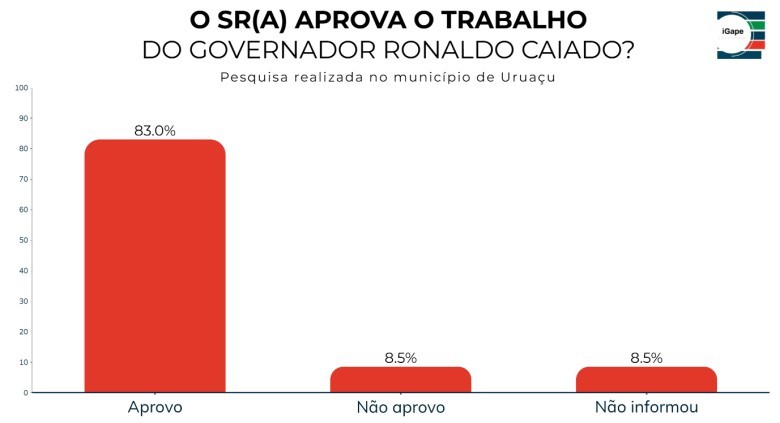 Levantamento realizado pelo Instituto Gazeta de Pesquisas (IGAPE) em Uruaçu mostra que o governador Ronaldo Caiado (União Brasil) mantém alta aprovação no município. Segundo a pesquisa, 83% dos entrevistados disseram aprovar o trabalho do governador à frente do governo de Goiás.