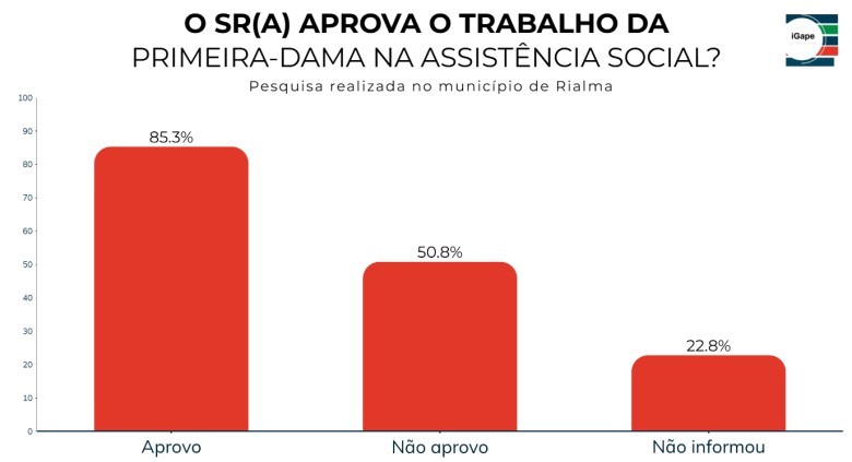 Pesquisa realizada pelo Instituto Gazeta de Pesquisas no município de Rialma mostra que a gestão da Primeira-Dama Aline Gomes à frente da Secretaria de Assistência Social é bem avaliada pela população. De acordo com o levantamento, 85,3% dos entrevistados disseram aprovar o trabalho desenvolvido pela pasta. Outros 5,1% declararam não aprovar a atuação, enquanto 9,6% preferiram não responder.