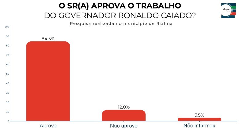 Levantamentos do Instituto Gazeta de Pesquisas mostram que o governador Ronaldo Caiado mantém altos índices de aprovação em cidades do interior de Goiás. Em Rialma, 84,5% dos entrevistados disseram aprovar a gestão à frente do Governo de Goiás, enquanto 12% afirmaram não aprovar e 3,5% não souberam ou preferiram não opinar.