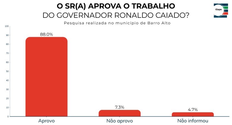 Já em Barro Alto, a aprovação foi ainda maior: 88% dos entrevistados avaliaram positivamente a administração de Caiado. Outros 7,3% declararam não aprovar a gestão e 4,7% não souberam ou não opinaram.